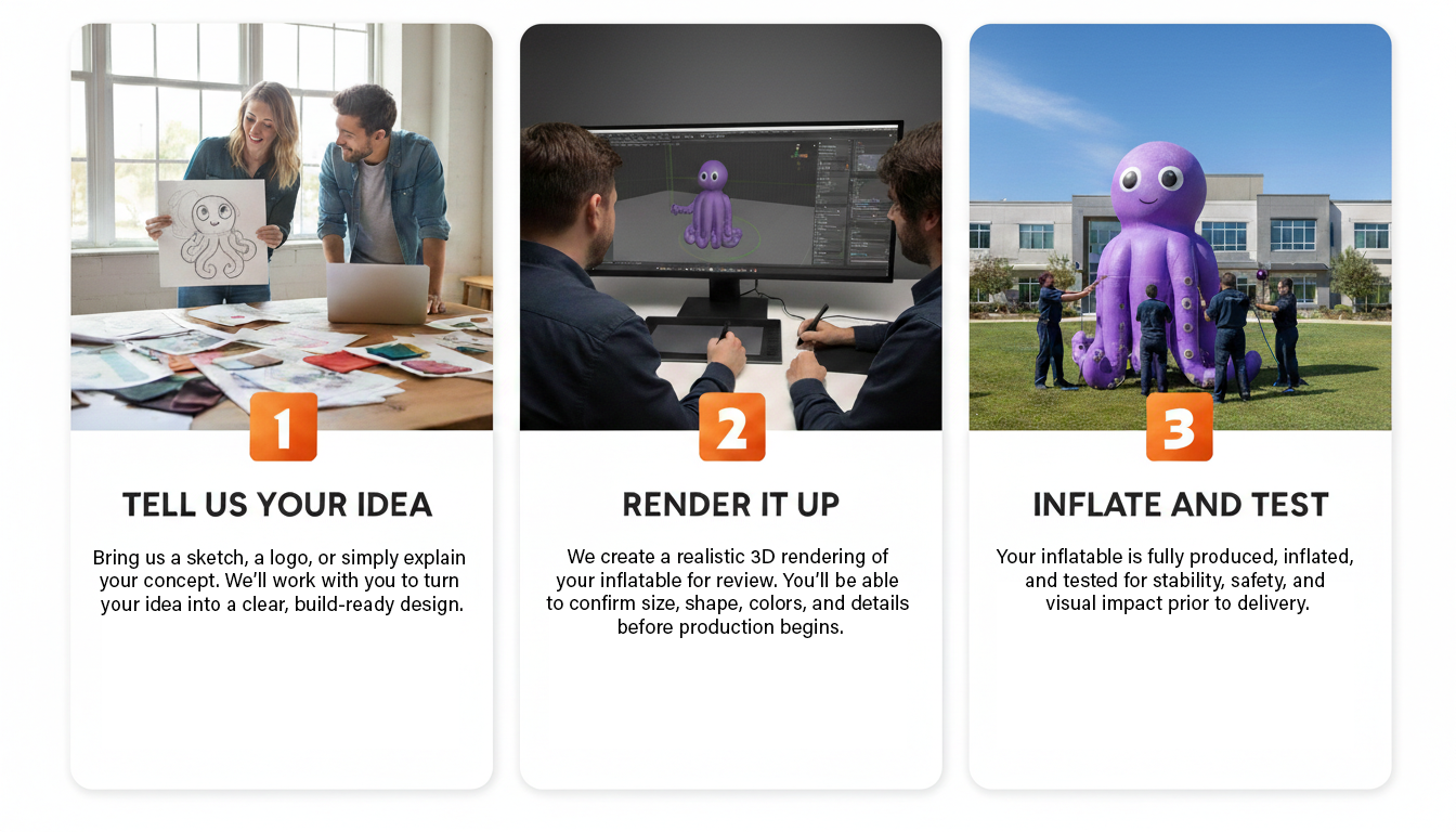 Your inflatable is fully produced, inflated, and tested to ensure stability, safety, and visual impact before delivery.GET A CUSTOM QUOTE