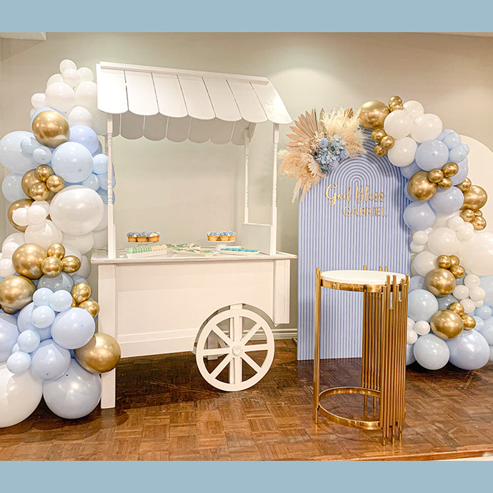 To further enhance the celebratory atmosphere, a Sweet Cart adorned with a matching Balloon Garland is included. The Sweet Cart serves as both a decorative element and a delightful treat station, offering guests a variety of delectable goodies to indulge in.