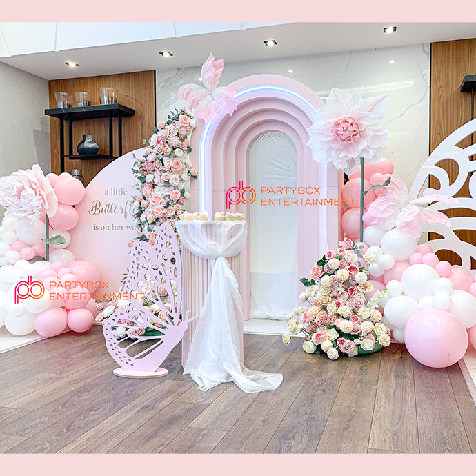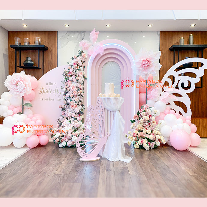 We offer butterfly-shaped backdrops and a breathtaking custom Balloon Garland over 15 feet long. Our stunning selection of backdrops includes 3D Stepped Ripple, floral arrangements, and an expansive stage setup.
