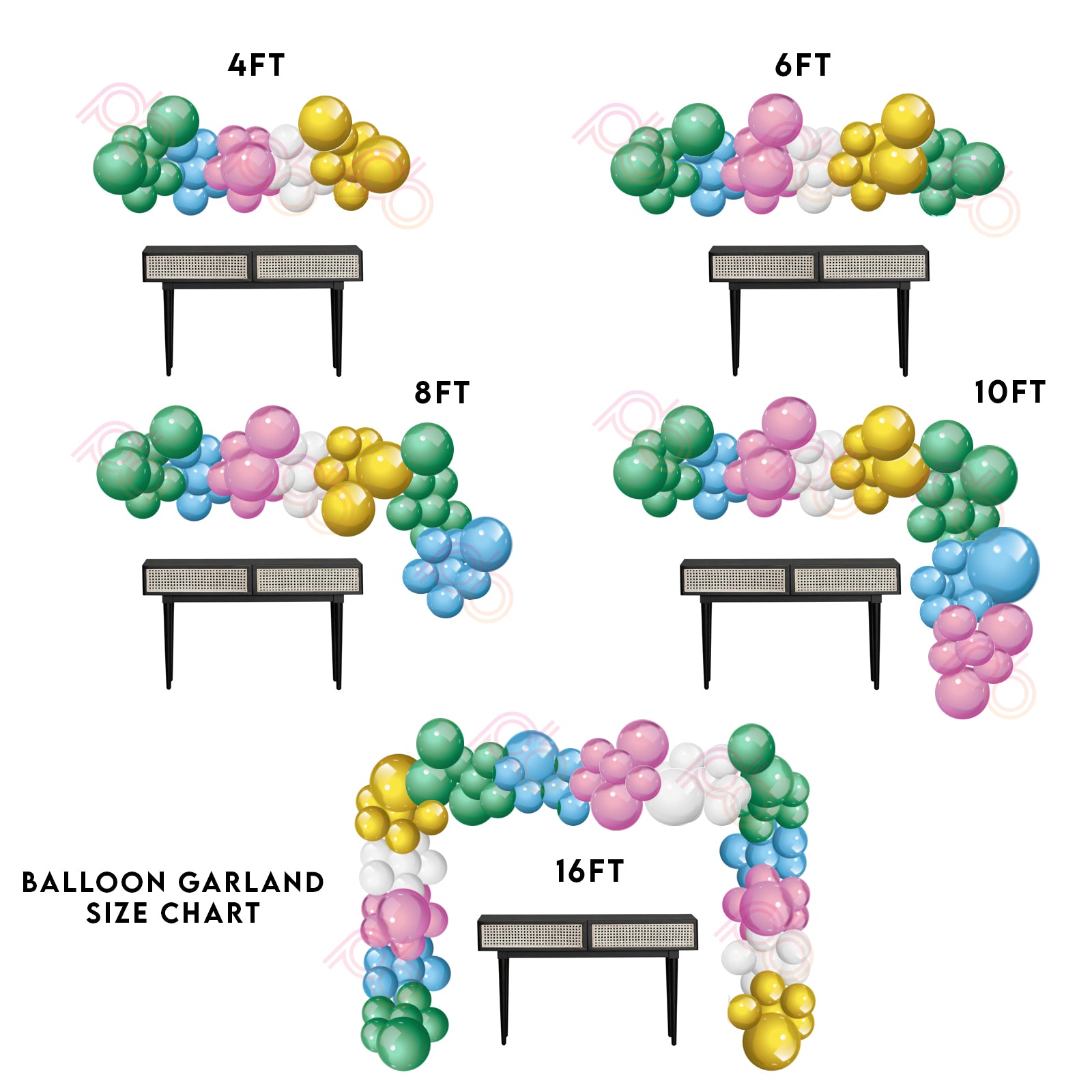 | Size | Recommended Garland Length | Balloon Count & Breakdown |