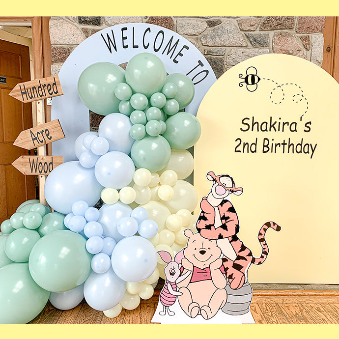 This charming setup includes a beautifully crafted Arch Backdrop, a delightful Balloon Garland featuring Pooh and his friends, a Custom Sign with your personalized message, and adorable Character Cutouts of Winnie the Pooh, Tigger, Piglet, and more.